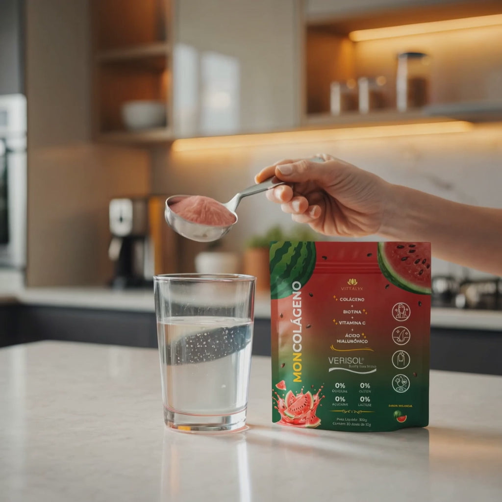 Composto por colágeno hidrolisado, biotina e vitamina C, ele age de forma sinérgica para promover mais elasticidade, firmeza da pele e fortalecimento dos fios e das unhas, além de contribuir para a síntese natural de colágeno no organismo.